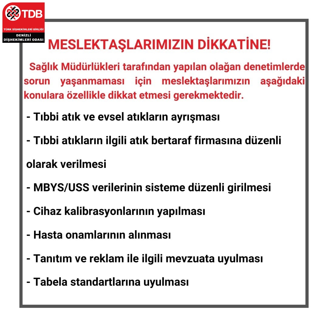 Sağlık Müdürlüğü tarafından yapılan olağan denetimlerde sorun yaşanmaması için meslektaşlarımızın aşağıdaki konulara özellikle dikkat etmelerini rica ederiz.